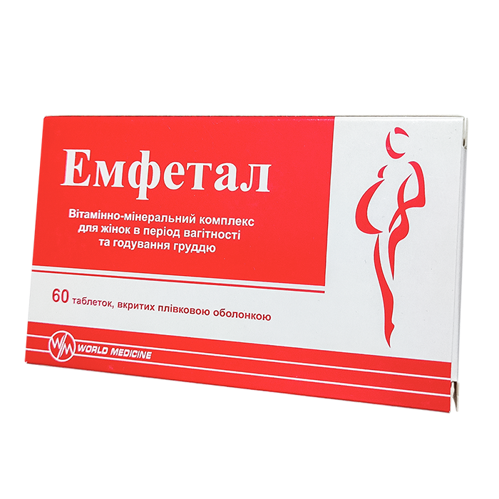 Эмфетал – комбинированный продукт для беременных и кормящих женщин. Действие продукта обусловлено эффектами входящих в состав витаминов и минеральных веществ. Витамины участвуют в обмене веществ как катализаторы и регуляторы биохимических и физиологических процессов. Минеральные вещества являются жизненно необходимыми элементами для обменных процессов в организме человека. Участвуют в построении клеток и тканей организма, деятельности ферментных систем.