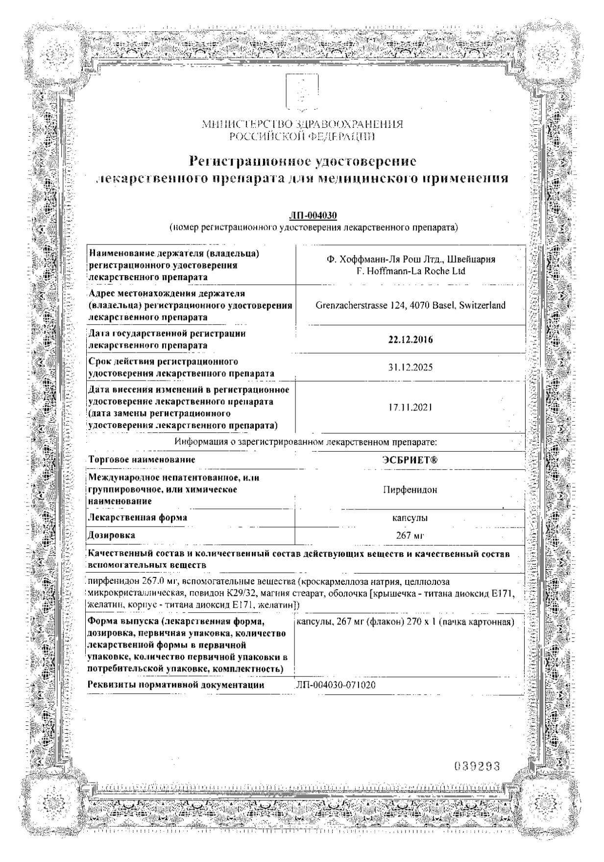1 капсула Эсбриет содержит действующее вещество: пирфенидон – 267 мг.