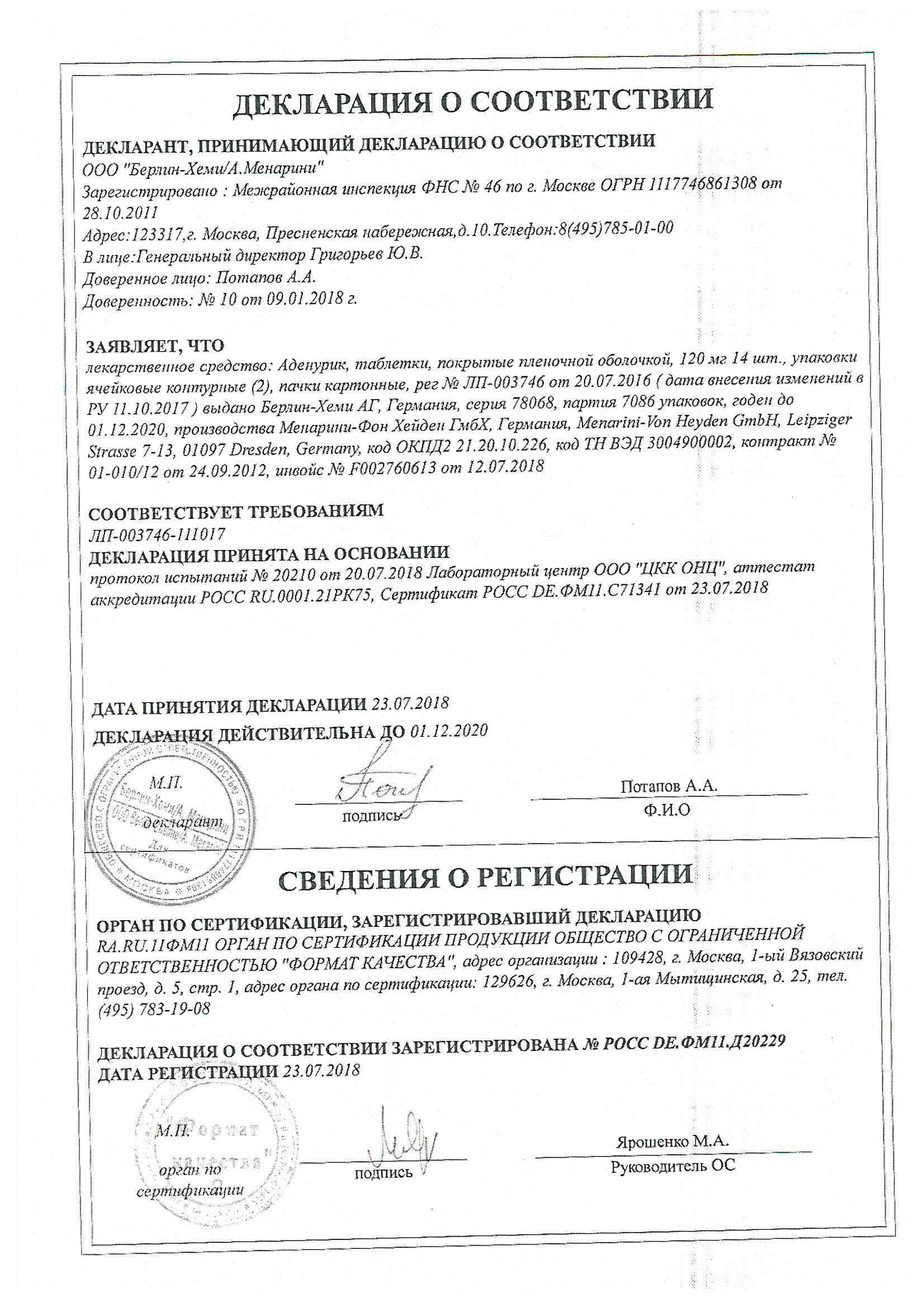 Рекомендованная доза составляет 120 мг фебуксостата один раз в сутки независимо от приема пищи. Препарат Аденурик® следует начинать принимать за два дня до начала цитостатической терапии. Длительность применения препарата Аденурик® должна составлять не менее 7 дней. В зависимости от длительности курса химиотерапии продолжительность применения препарата Аденурик® может быть увеличена до 9 дней.
