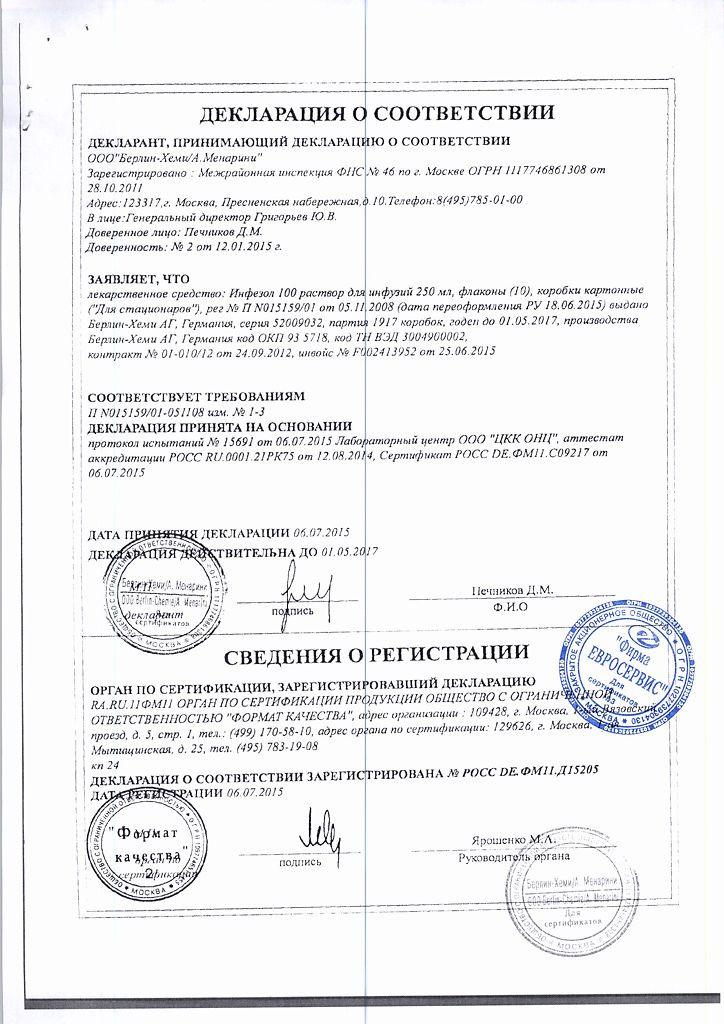 Противопоказания. Абсолютными противопоказаниями к применению раствора Инфезол 100 является тканевая гипоксия, шок и другие состояния с нестабильным кровообращением и угрозой для жизни, а также детский возраст до 2-х лет.