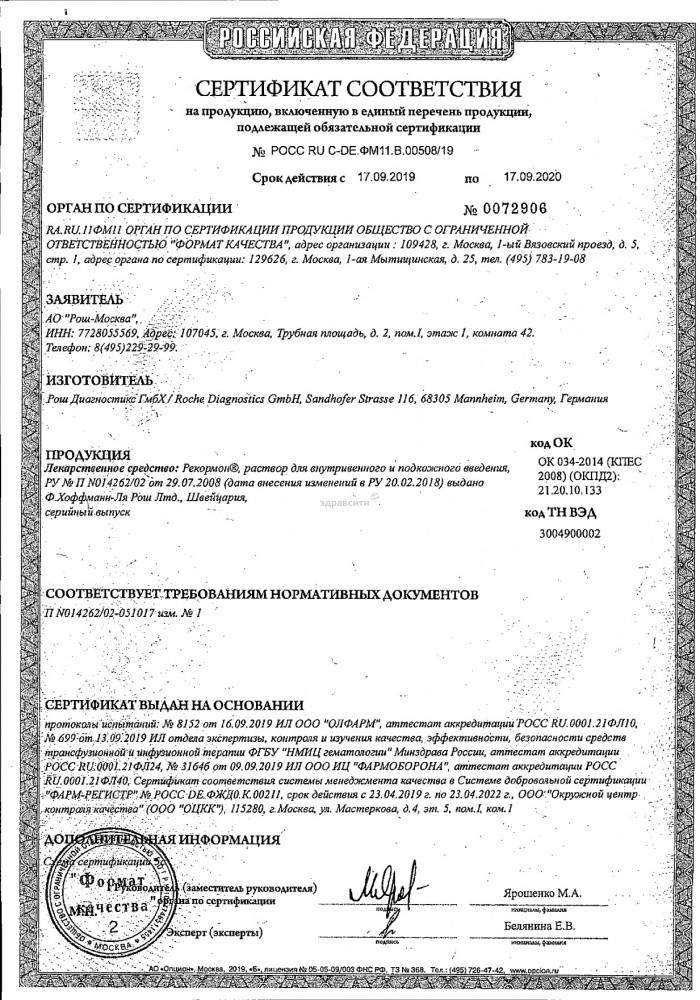 Показания. Рекормон (НеоРекормон) используется для лечения анемии, вызванной заболеванием почек. Препарат также используется для профилактики или лечения анемии у больных раком, получающих терапию, вызывающую анемию. С помощью Рекормона также можно лечить анемию, которая возникает у онкологических больных, страдающих, например, миеломой, неходжкинской лимфомой или лейкемией и получающих химиотерапию.