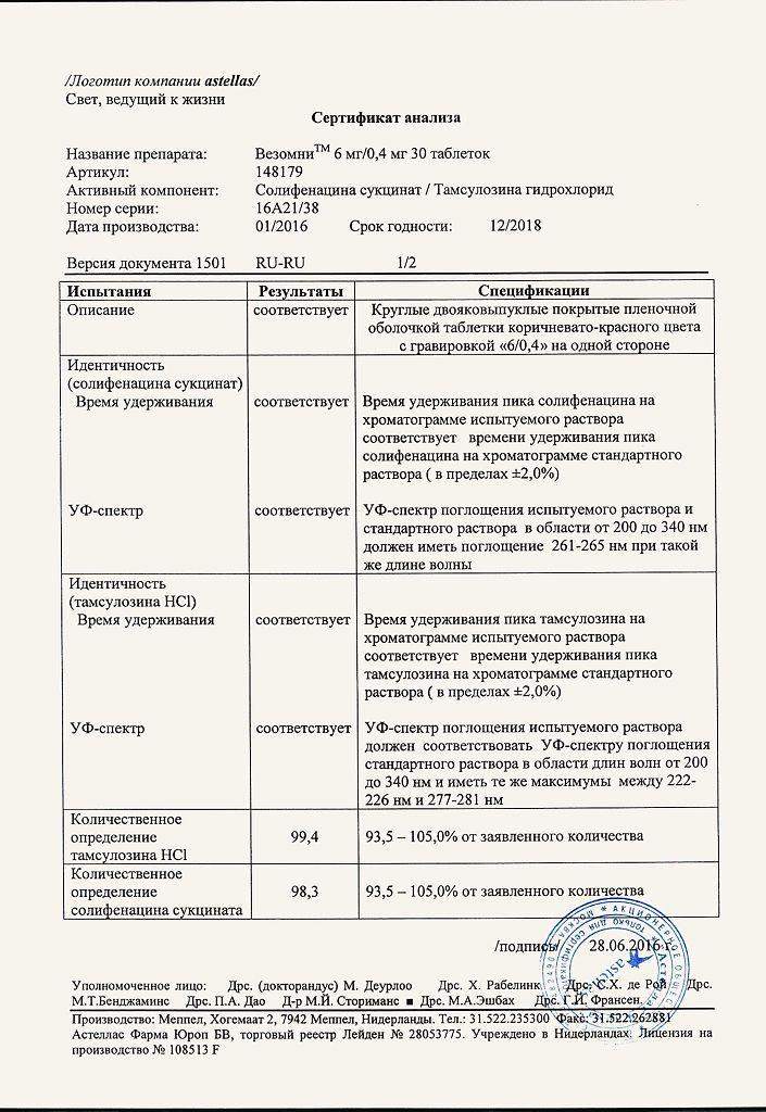 После многократного приема Tmax для солифенацина варьировало между 4.27 ч и 4.76 ч в разных исследованиях, для тамсулозина - между 3.47 ч и 5.65 ч соответственно. Cmax в плазме для солифенацина варьировала между 26.5 нг/мл и 32.0 нг/мл, для тамсулозина - между 6.56 нг/мл и 13.3 нг/мл. Значение AUC для солифенацина варьировало от 528 нг×ч/мл до 601 нг×ч/мл, для тамсулозина - между 97.1 нг×ч/мл и 222 нг×ч/мл. Абсолютная биодоступность для солифенацина составляет около 90%, в то время как тамсулозин абсорбируется на 70-79%.