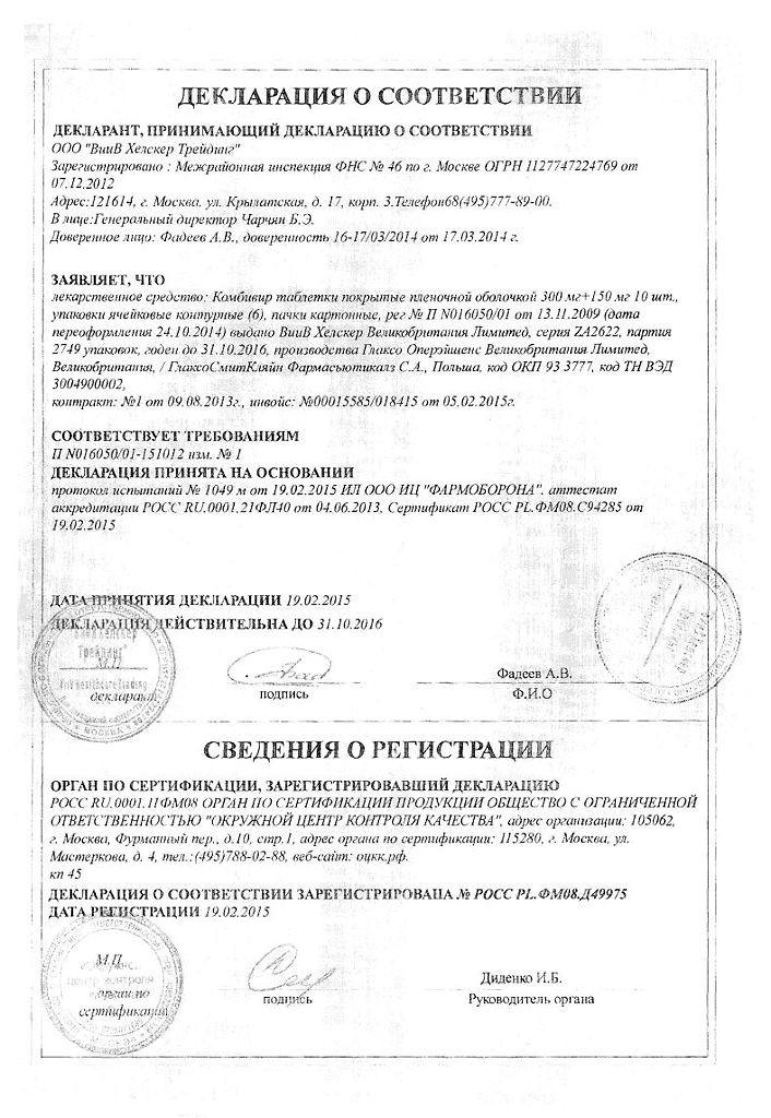 Комбивир выпускается в виде таблеток, № 60, покрытых оболочкой белого цвета, овальной формы с разделительной риской. На одной из сторон таблетки имеется надпись «GXFC3».