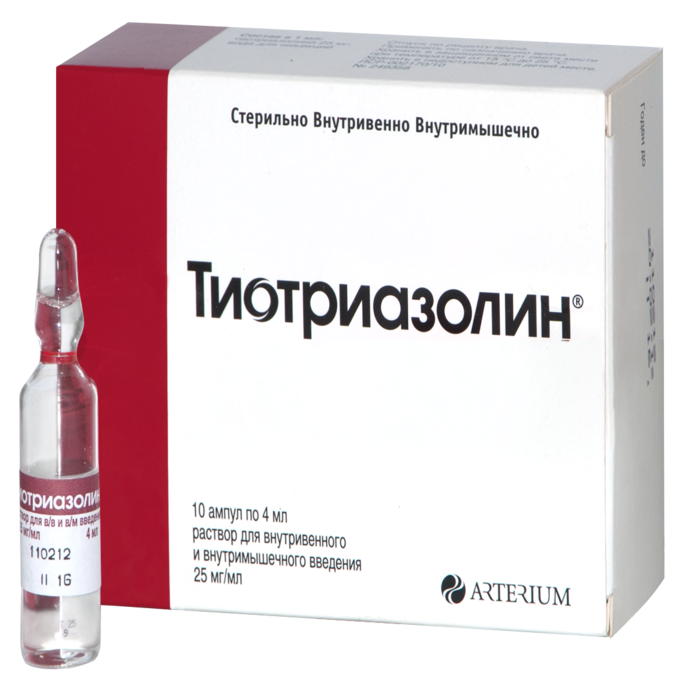 Раствор для парентерального применения Тиотриазолин (2,5%) по 4 мл в ампулах, в картонной пачке 10 ампул, помещенных по 5 штук в контурные упаковки.