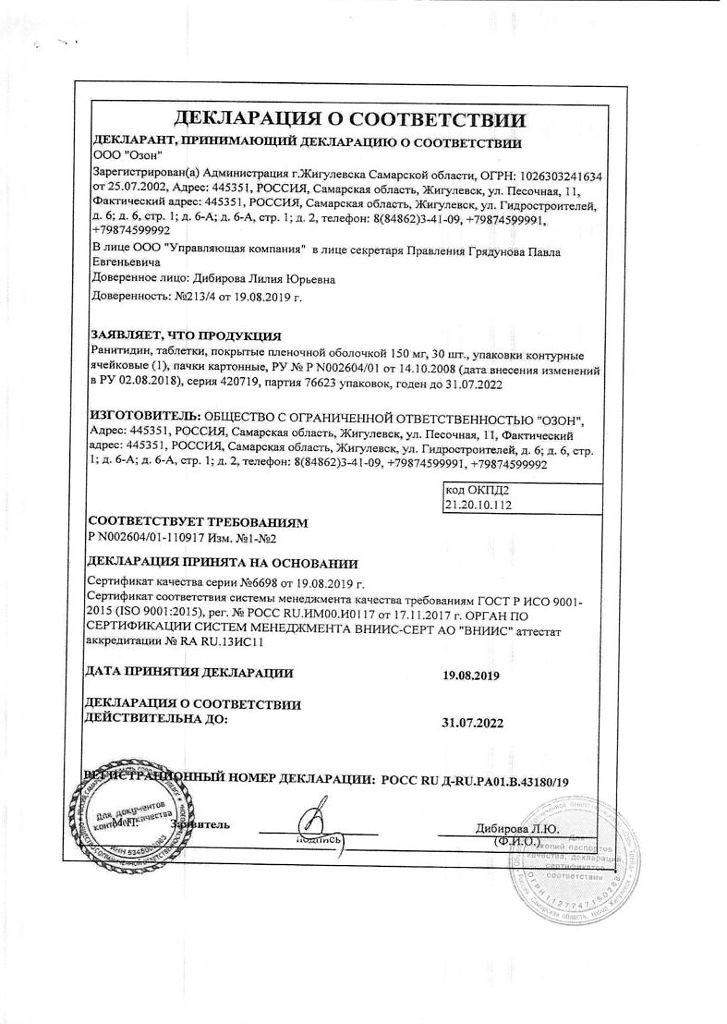 Ранитидин обладает продолжительным действием, длящимся примерно 12 часов после приема. Наибольшей концентрации препарат достигает спустя 2 ч после приема. Биологическая доступность активного вещества составляет 50%. Период полувыведения ранитидина – 2,5 ч. В основном препарат выводится из организма почками, как в виде метаболитов, так и в неизменном виде, частично – через кишечник с каловыми массами. При недостаточной функции почек (сниженном клиренсе креатинина) период полувыведения ранитидина увеличивается. Проникает через плацентарный барьер, не проникает через гематоэнцефалический барьер. Ранитидин входит в список жизненно важных лекарственных препаратов.
